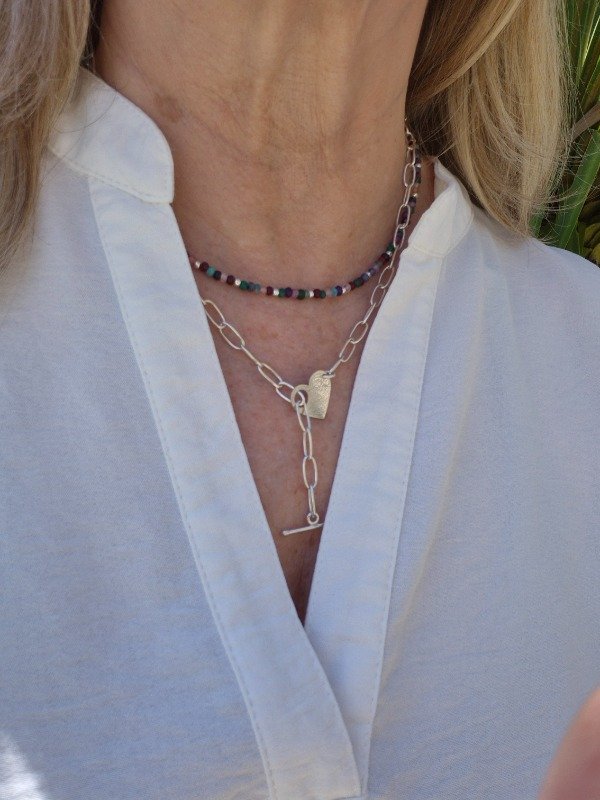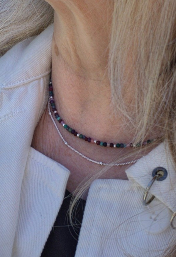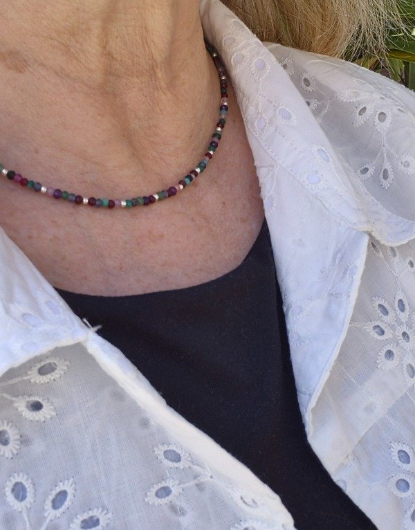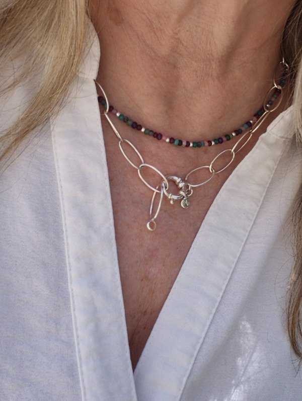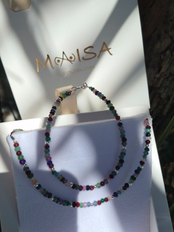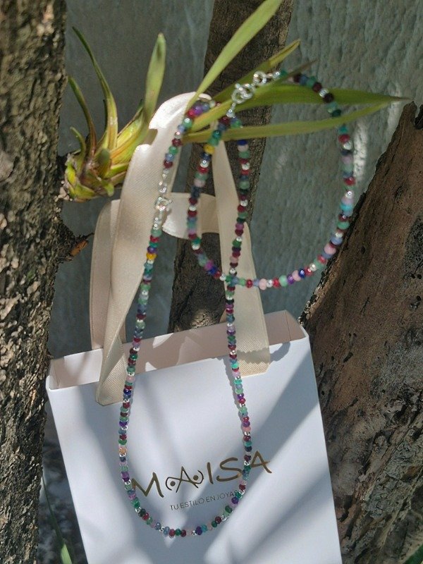 Collar de piedras naturales Ágatas multicolor con bolitas de plata y terminales y broche de plata.